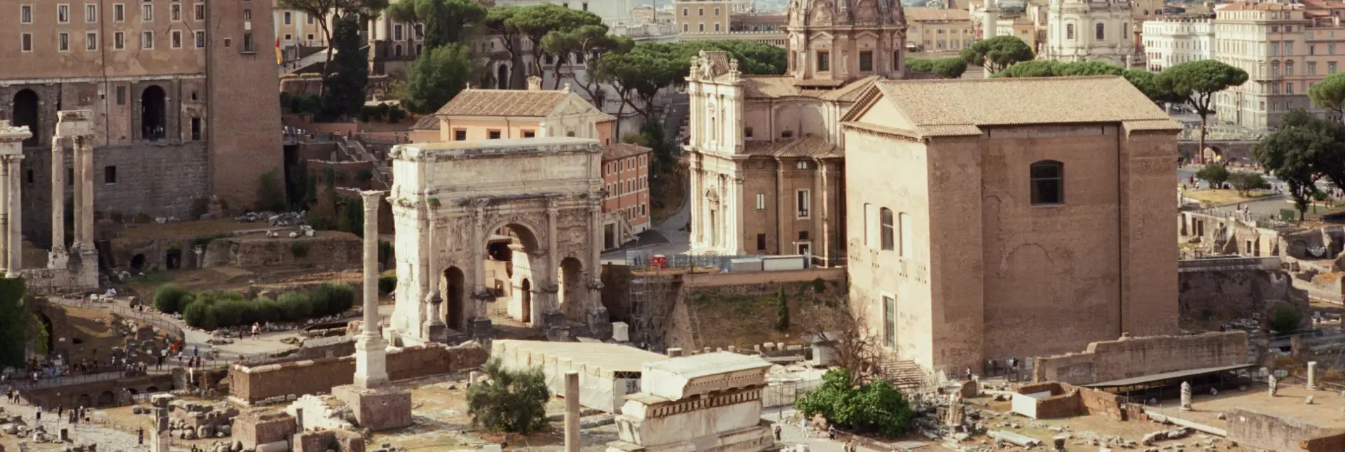 The Roman Forum, also known as Forum Romanum, was the epicenter of public life in ancient Rome. Located in the valley between the Palatine Hill and the Capitoline Hill, the Forum housed the most important buildings of the time: temples, basilicas, triumphal arches, and marketplaces. Among the most notable ruins are the Arch of Titus, the Temple of Saturn, and the Curia, where the Senate would meet.